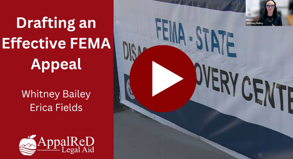 On September 22, 2025 Disaster Resource Attorney Whitney Bailey offered an online training "How to Draft and Effective FEMA Appeal." Click here to watch this one-hour training to learn more about FEMA individual assistance, drafting an effective FEMA appeal, and the appeal templates available at ardfky.org/disasterhub.