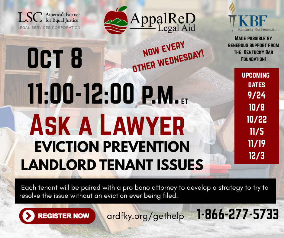 To register, please call AppalReD Legal Aid Central Intake at 1-866-277-5733 or make an online application.
