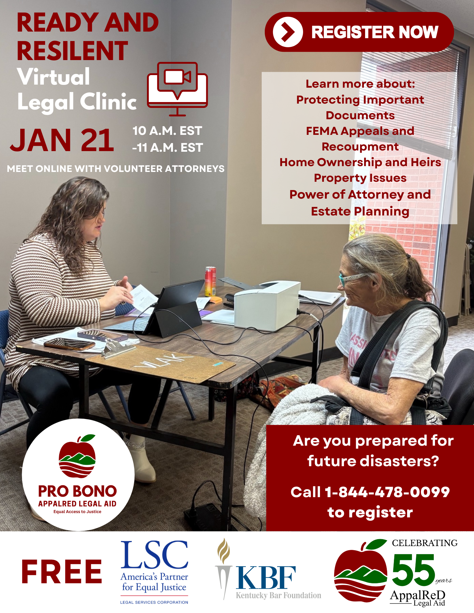 REGISTER today for this free online legal clinic by calling 1-844-478-0099. Get help with simple estate planning and learn about how to be READY when disaster strikes. This clinic will help low-income residents of our service area prepare for possible future disasters.