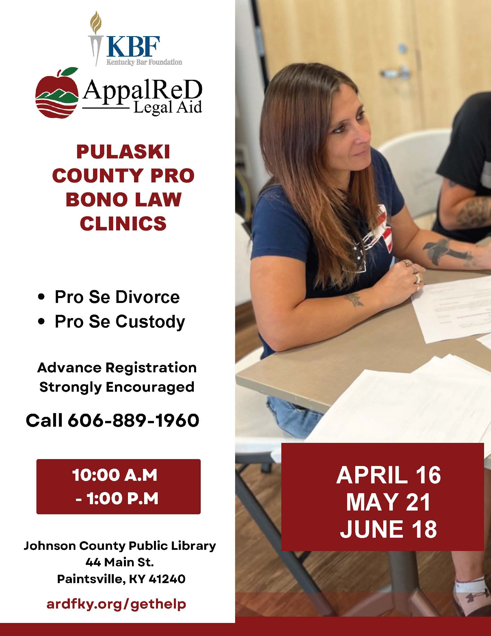 AppalReD Legal Aid's Pro Bono Team will be at the Pulaski County Library EVERY 3rd Thursday, starting January 15.