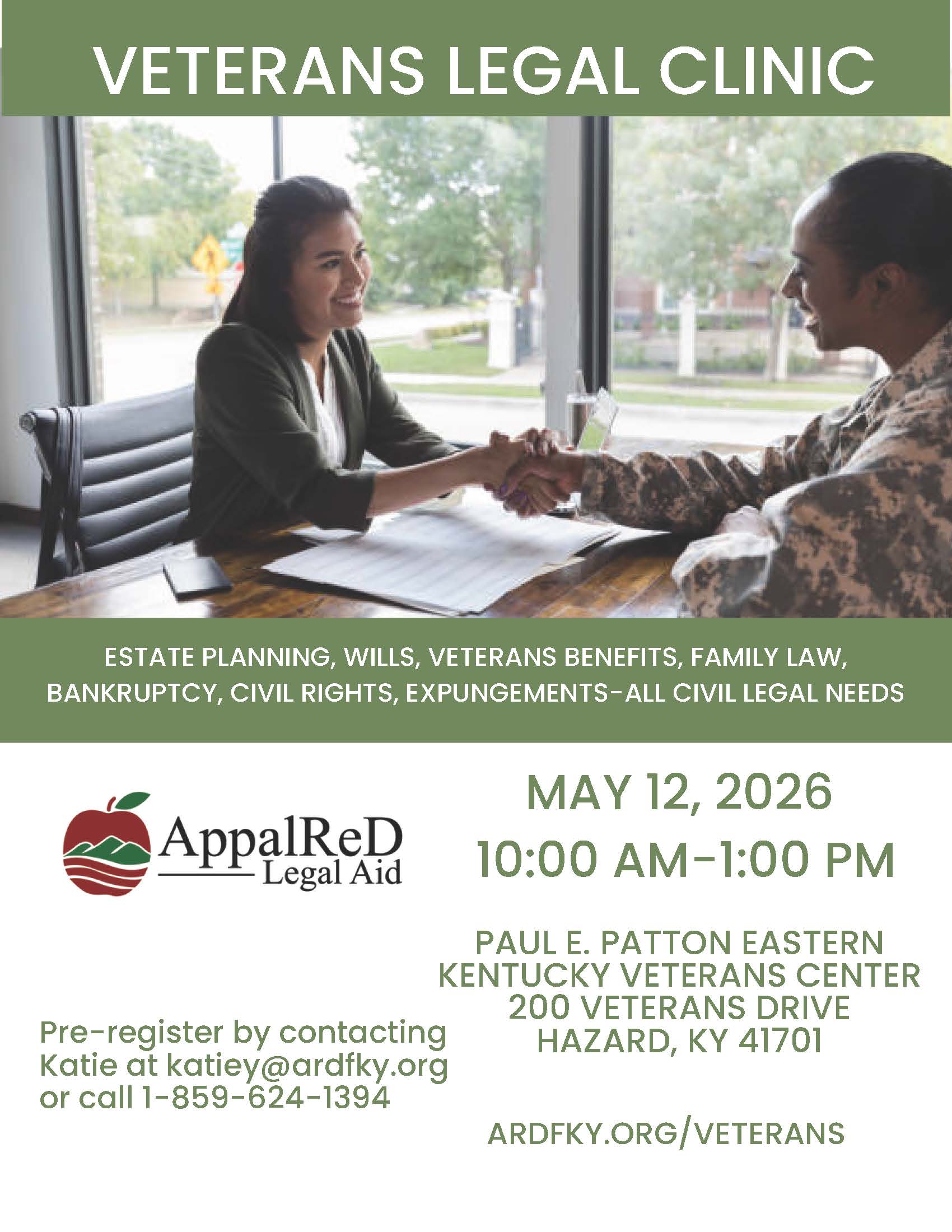 If you live outside AppalReD Legal Aid's service area, call 1-844-268-0VET[0838] or email veterans@laslou.org to see if you qualify for the Volunteer Lawyers for Veterans program. They can refer you to your nearest legal aid office.